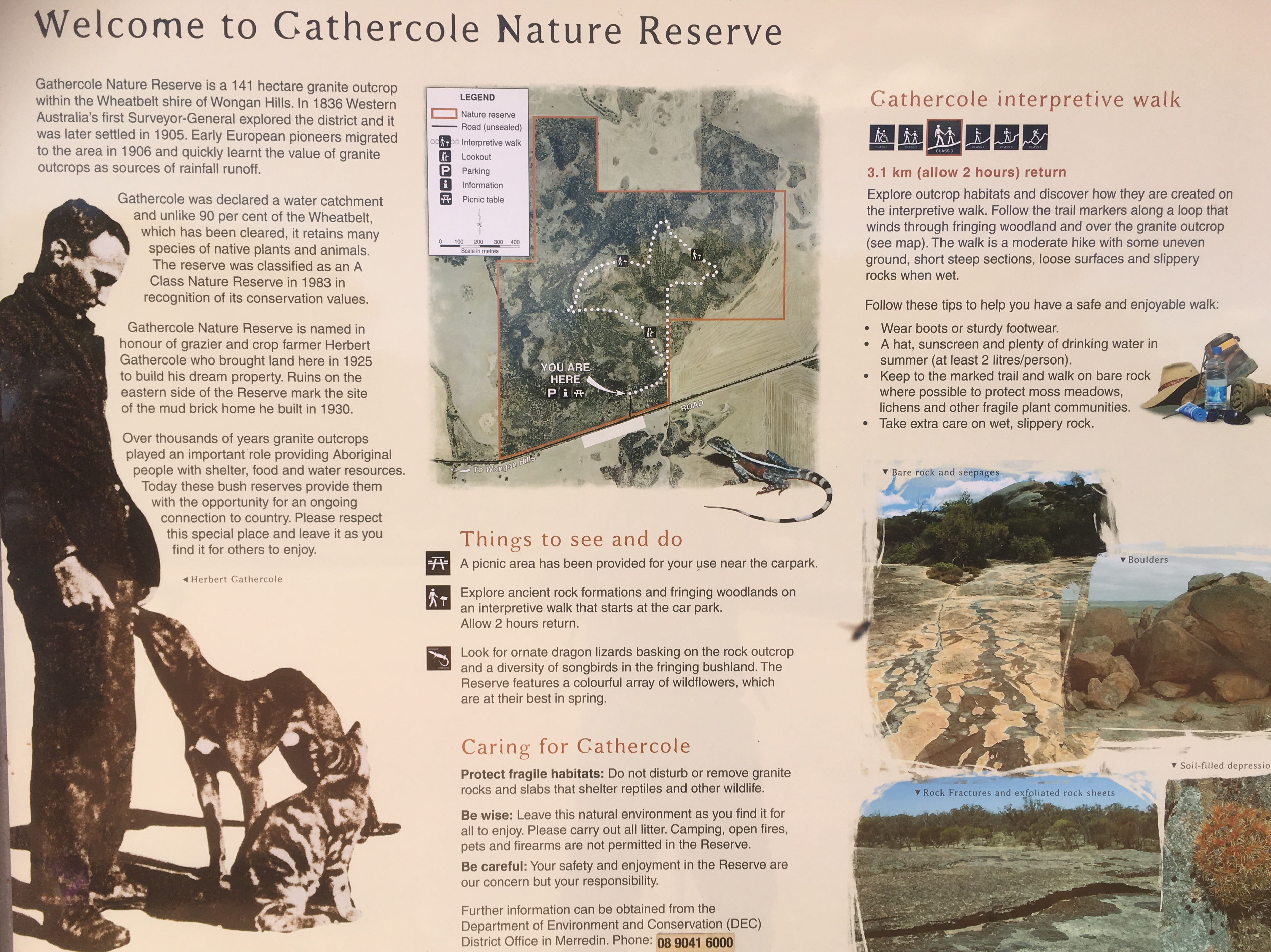 So next day where to go? Well first off it was back into town, talked to the same volunteers (Greg and Alfreda) who loved hearing the feedback on the Mt Matilda walk heritage walk, there were two other wildflower walks nearby, (other than the Christmas Rock walk) and they were arguing over over which was better the Wongan wildflower walk or the Gathercol reserve walk. Well us with our logical thinking brain decided that what the heck why don’t we do both? And if time permits why not throw in the old favourite Christmas rock walk to boot.
