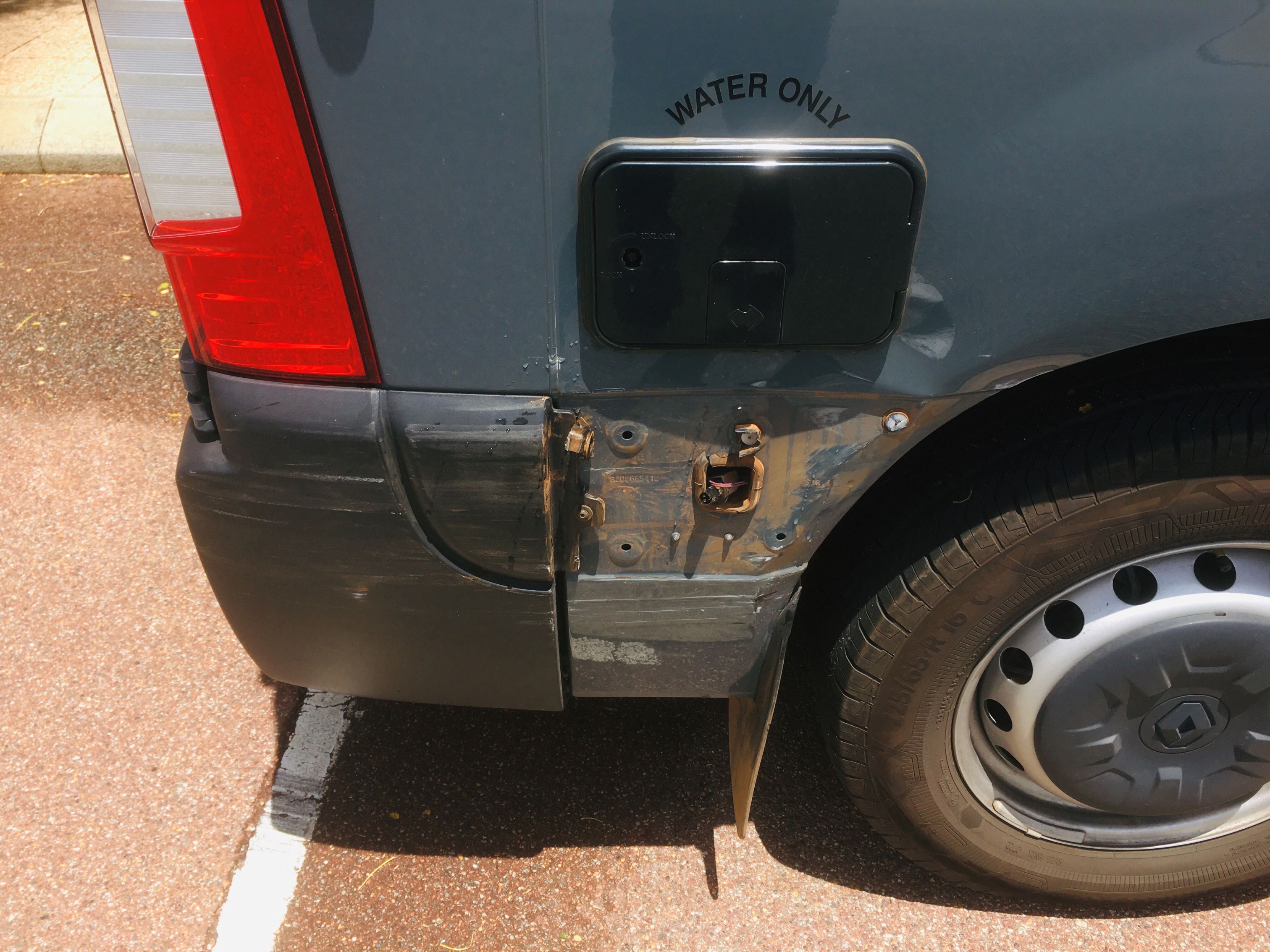 Then the drama started in getting it repaired. Turns out our insurer (CIL) doesn’t know anybody in WA that repairs campervans. Essentially they said “go find someone to repair it and then let us know who it is”. “WTF” I mean isn’t that why we pay a premium on insurance! And as it turns out the caravan places won’t touch it because its a vehicle (ie: It’s NOT a caravan), and most of the panelbeaters/repairers here won’t do it because its too big and high to fit in their spray booth. So the only way you can repair it would be to get a specialist truck/van repair mob to do it… there is one here in Perth about 75km away with a long waiting list. After going around doing the “can you help me thing” I found a local guy who said he could do it, but not in a spray booth, go ahead give me the quote, turned out it was about $3500 to fix the dent, paint, replace the trim and decals polish and it would take 3 days. A heap of thanks for Fatal FX Panel & Paint here in Rockingham