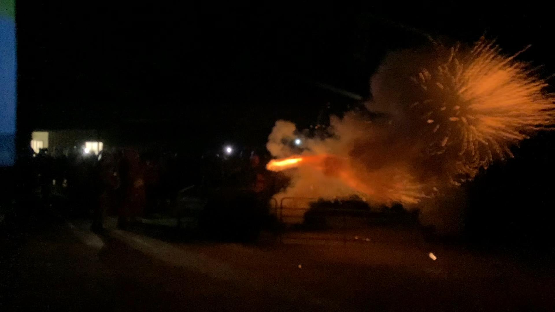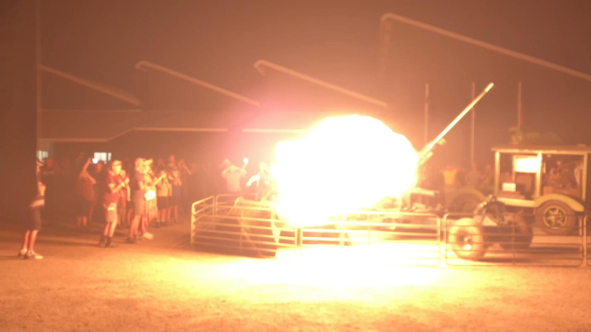 We took our little chairs and set up off to one side alongside a truck and sat back to wait. they gave us a speel about what they were going to do, fire a cannon off then run the light then fire the cannon again. They said OK do the countdown… then silence then an almighty bang, the crowd jumped, our ears rang, the dogs barked and the huge flash, bang and sparks erupted from the cannon hung around.