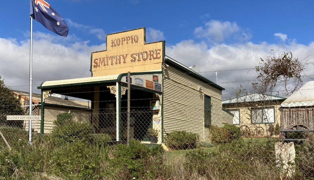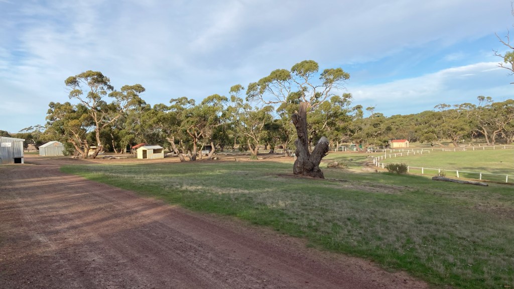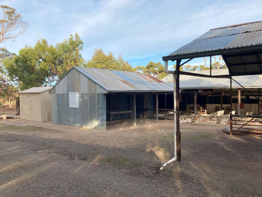 Camp last night was at Yallunda Flats showground, not far from the museum, and while not everyone’s cup of tea, suited us fine. This place is a little unique, you have to be self contained, no power available but there are plenty of toilets around.  Its $5 per head by donation into an honesty box. No fires between November and May so it could have been even better if we had had a fire. We drove around the main oval looking for somewhere to set up, and decided down the back under some big gums seemed good, so finding a level piece of ground we parked and sat back. Wrote a bit and then went for a walk, exploring the grounds and various outbuildings. Found a great awesome shearing shed/ bar/ fire pit / stage place and thought about moving up to that but we were comfy where we were. Went back and had tea, watched a movie and drifted off to sleep.