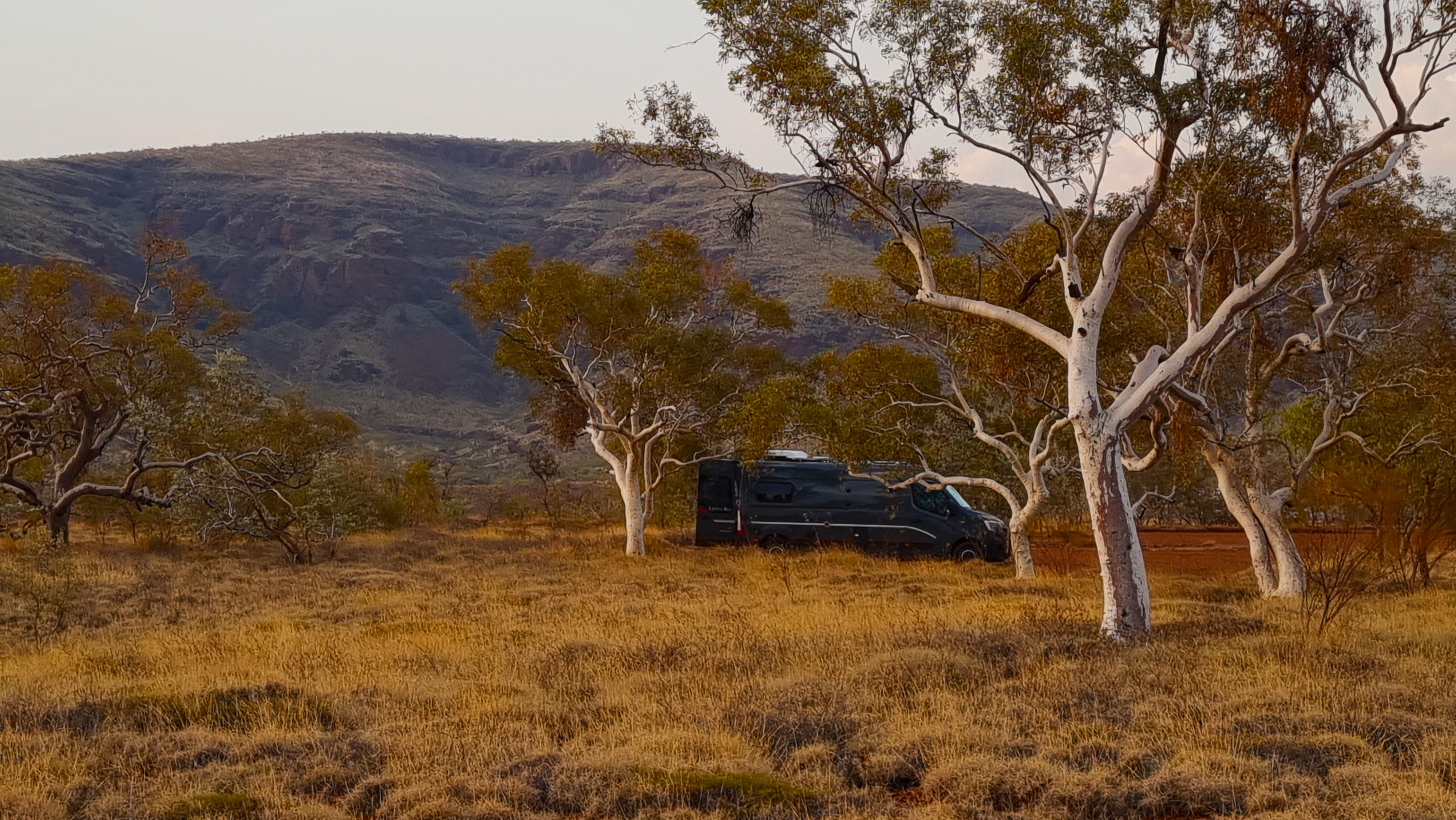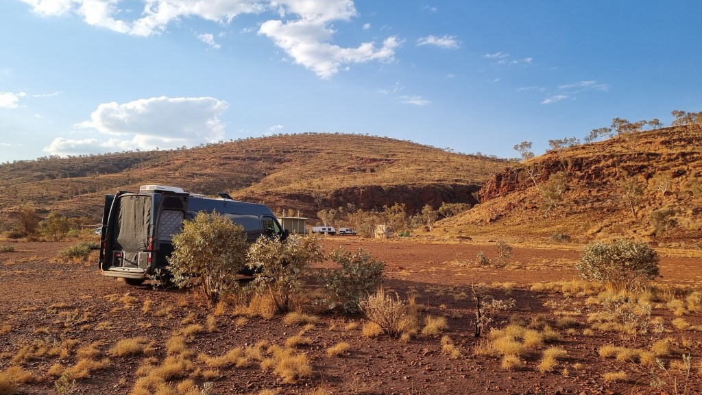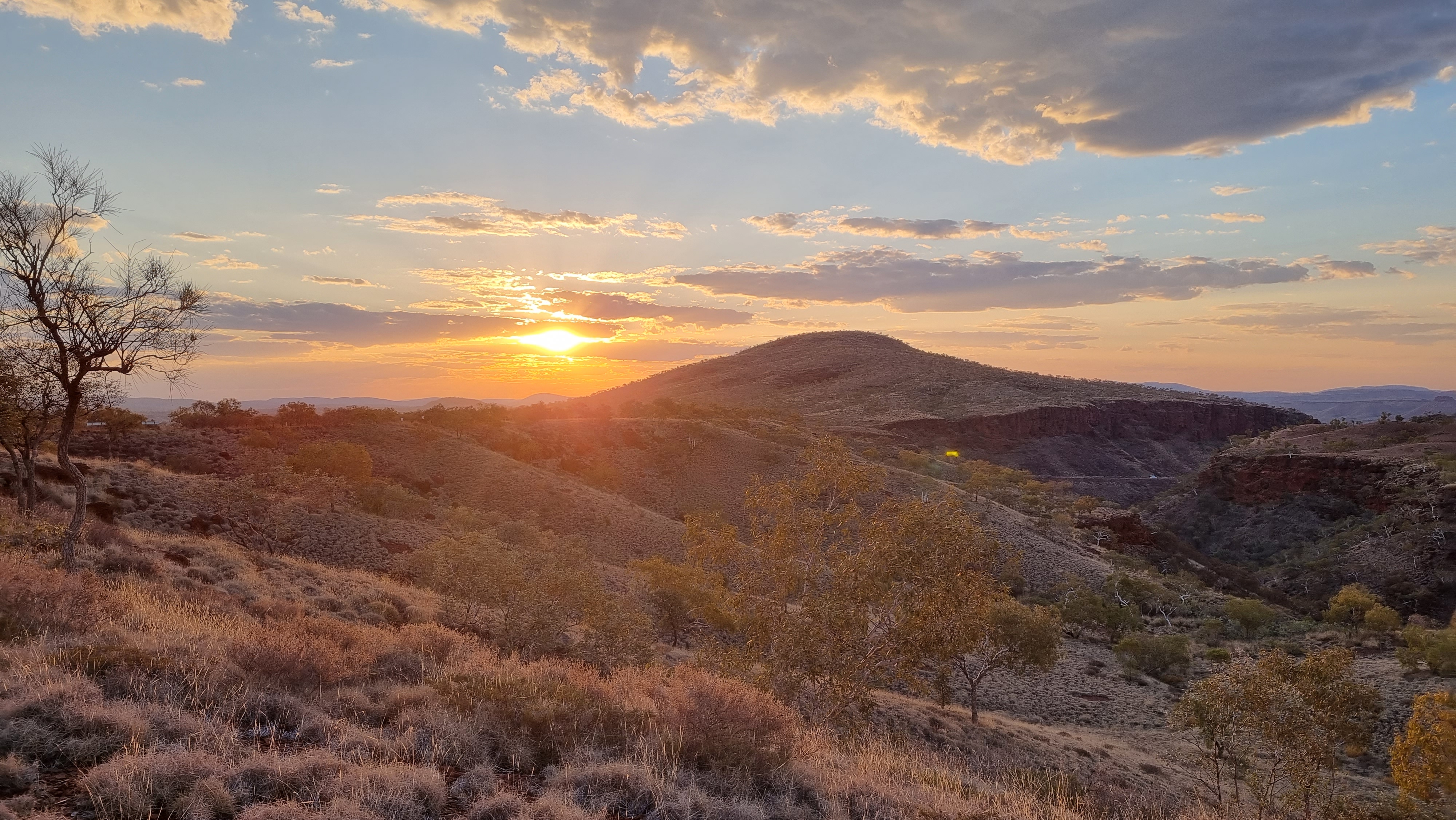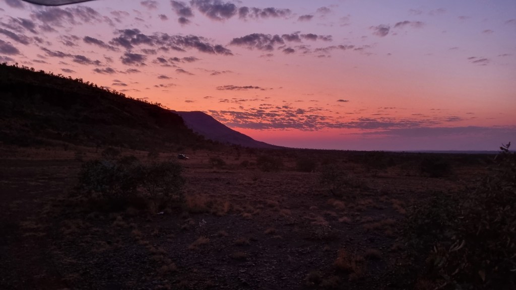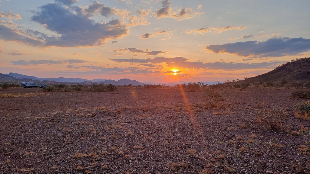 Back up the steps and then back to Little Bus. We spent a bit more time in the Dales Gorge area, then finally it was time to head off to camp. So, back to the highway and up to Albert Tognolini lookout, a free camp overlooking a gorge just near the Auski roadhouse, and yet another amazing sunset.