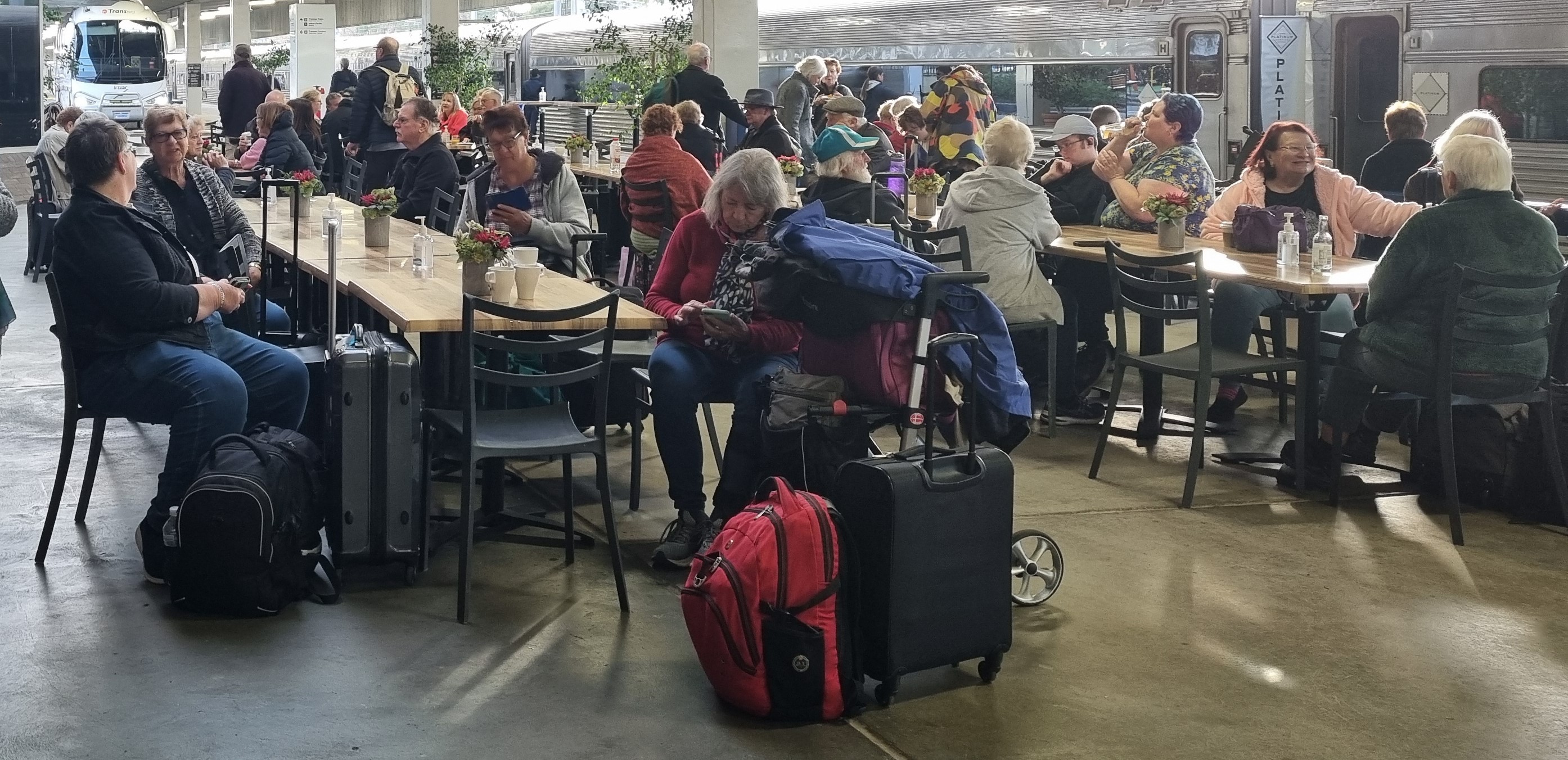 We piled a small plate with pastries, filled our cups with hot chocolate and sat back, two of perhaps 150 people waiting to board whilst enjoying the pre-trip entertainment. We wandered up and down the platform and as is my want examined all the displays in the terminal building, then at 9 AM we were ready to board.