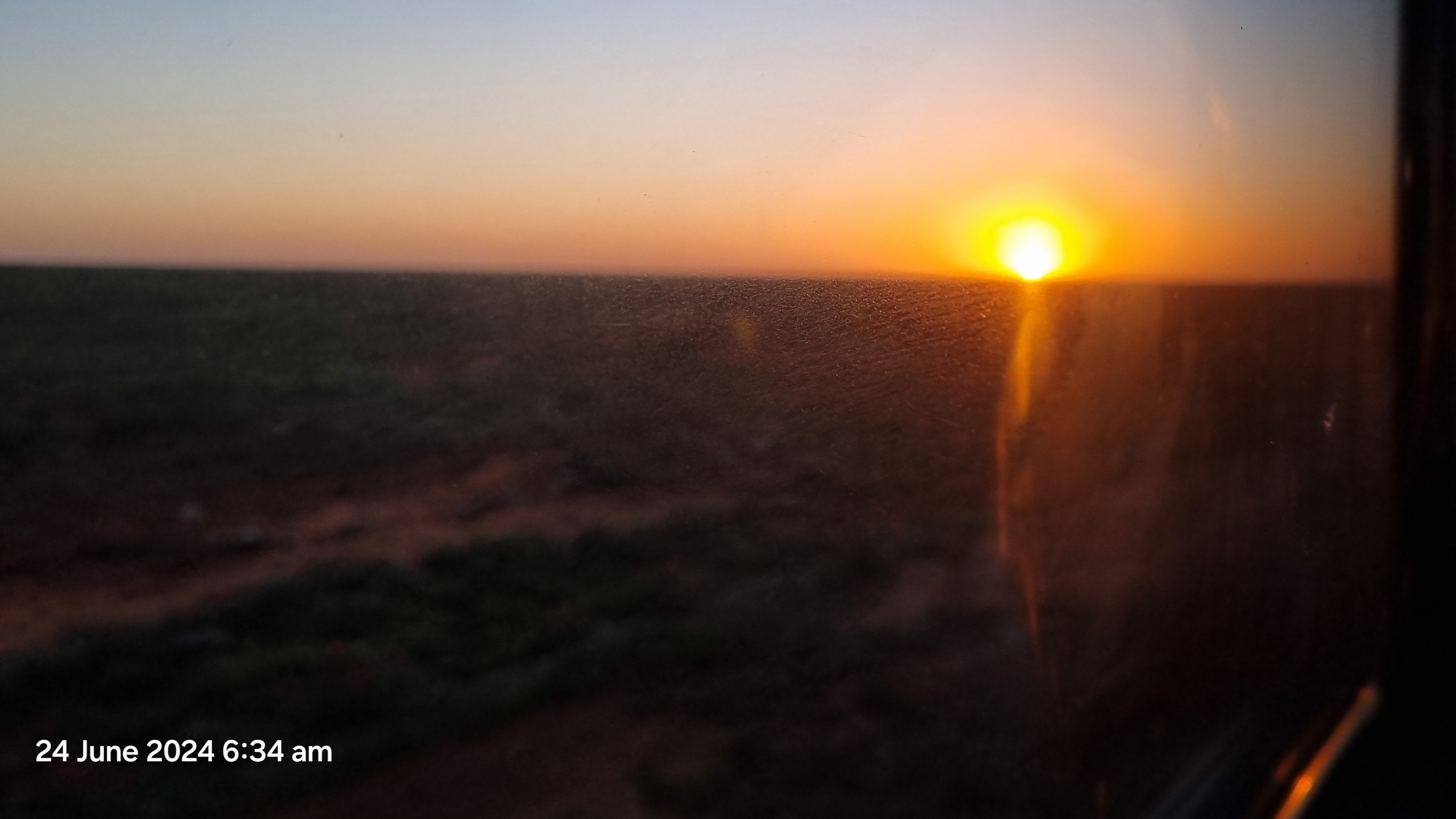 Back on the train it was time to depart and then we sat, again with a special beverage and watched South Australia roll by. Dusk saw us parked up in Broken Hill watching the colours change on the hills awaiting the change of driver, we were not allowed off the train but it wasn’t long before we rattled and bounced our way into the night…..