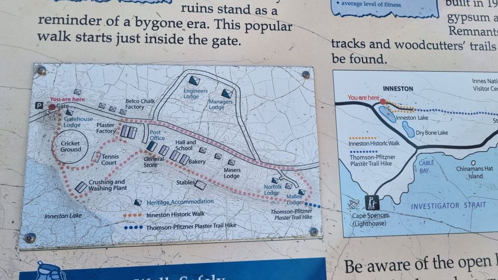 Innes is named after the town if Inneston which was a gypsum – plaster mine, the plaster and gypsum being exported from the Stenhouse Bay jetty. Little remains of the railway and town, and the heritage walk gives very little information on what does remain.