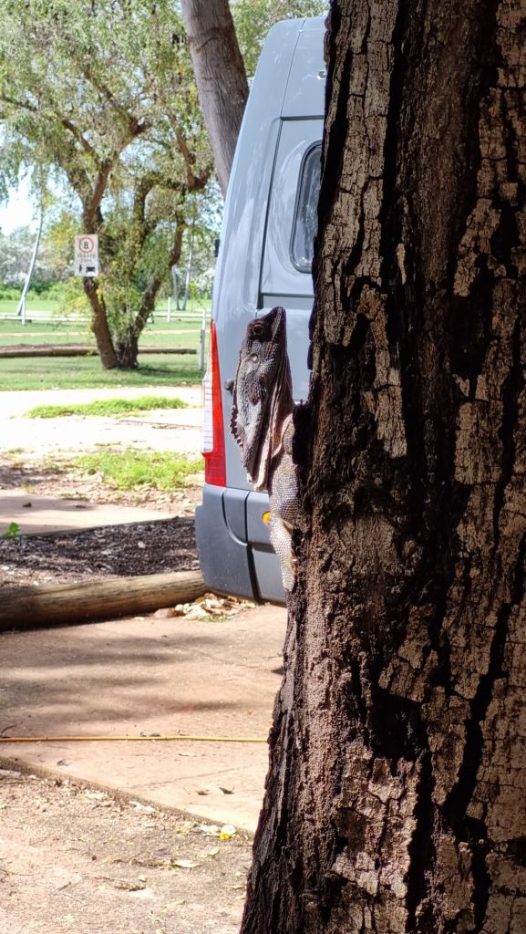 The caravan park was happy to see us back again. We really liked the Broome Caravan Park and would happily stay again, but it might be different when it’s full! The best part was having a frilled neck lizard come visit.. and he didn’t mind having his photo taken at all