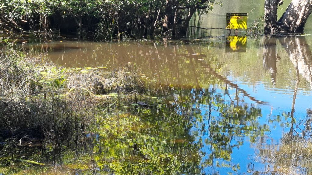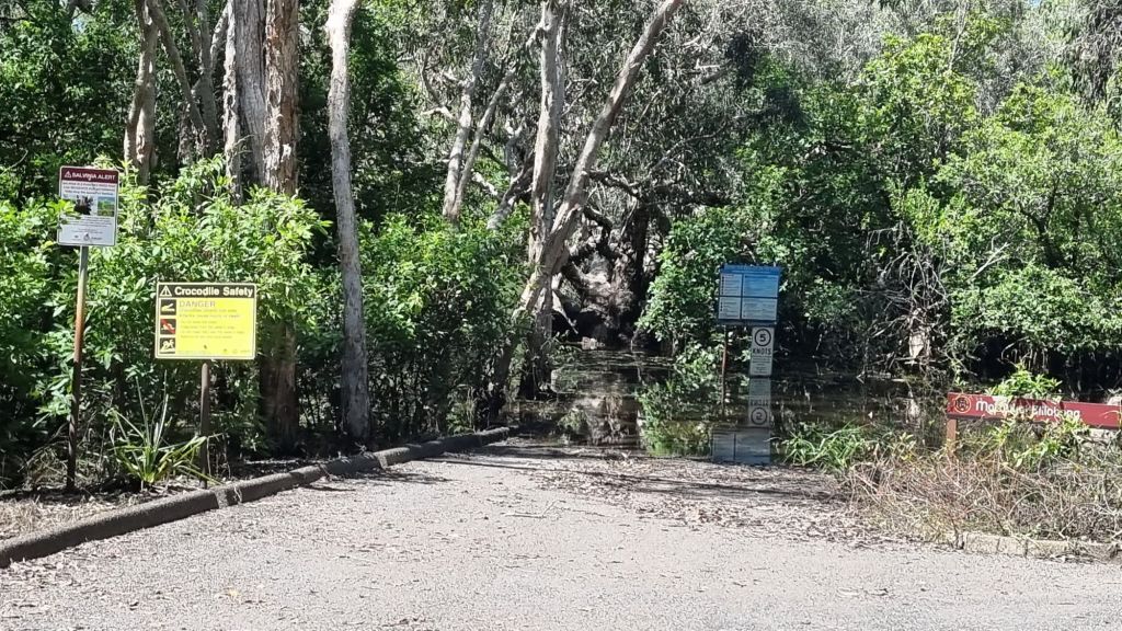 We did have a laugh when we snuck down into a campsite that had a boat ramp. The campsite was closed, but the boat ramp was open, and the river had come up. There next to a “crocodile safety” sign was a thong floating in the water… it tickled my sense of humour. “Wonder where the rest of him is,” but then it it would have been better if it was someone’s croc floating instead of a thong.