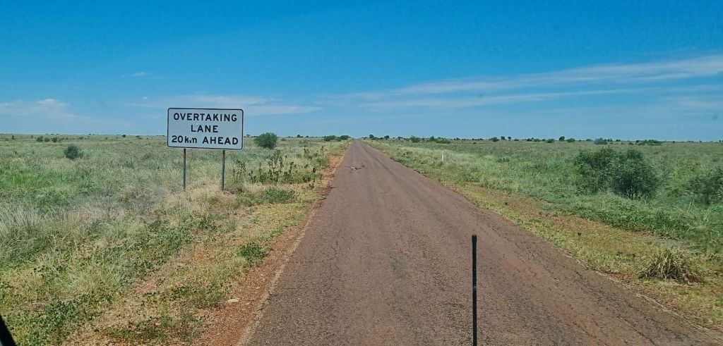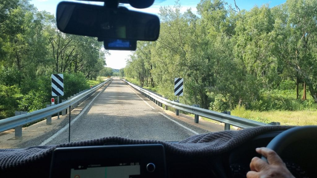 We started off OK, even had two lanes for a bit, then down to one with water crossing, cows on the road, closed in vegetation but still pretty good. The speed limit was sign posted at 110km/hr, now that made us laugh. We got to some wide sectons, maybe 10km of two lanes, almost a normal highway, except for the “wumpa dumps.” Theye are those almost invisible humps in the road that you go over and everything becomes airborne and you get weightless “negative g” sensation just before you come crashing back down, and it takes that micro second for your breakfast to catch up, but by then you’ve hit the next one. Fortunately, we had packed everything pretty well, so most things stayed where they were meant to.